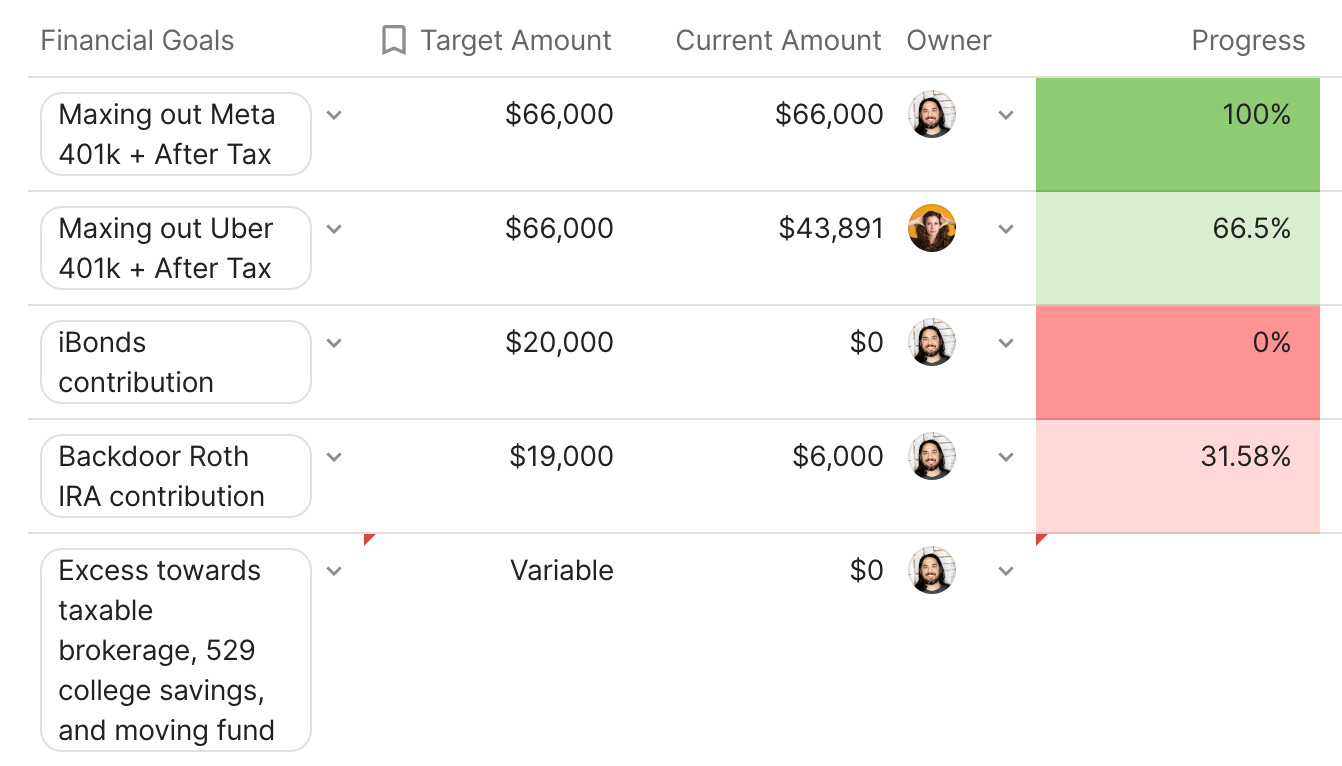 Notes: This goal should be updated from $13,000 to $19,000 since I contributed to my partner’s Backdoor Roth for 2022 in March.