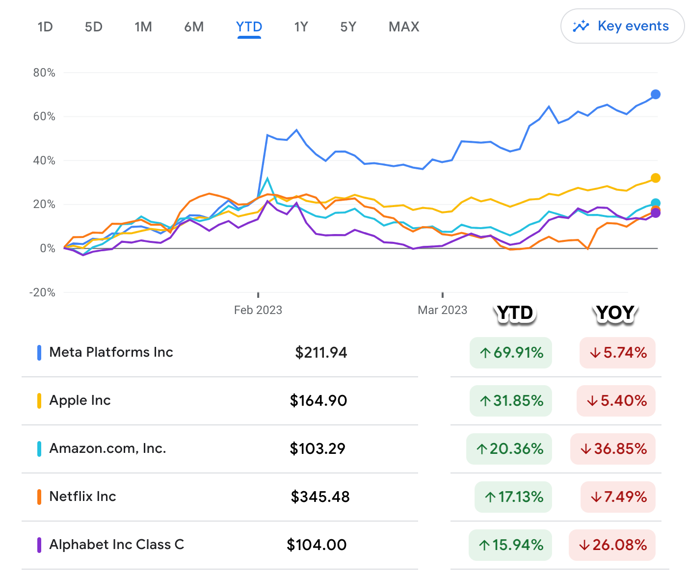 Year to Date FAANG Stocks up 17-76% (still very down year over year)