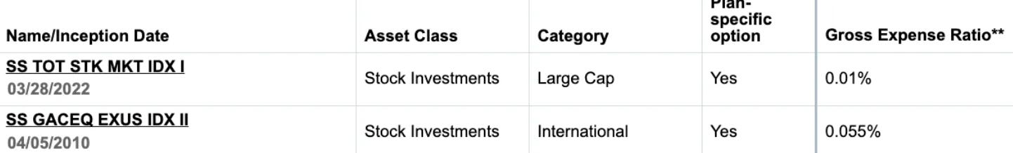 Let’s look at Meta’s 401(k) for example. I have access to a full array of funds that I couldn’t get as a normal consumer. These are institutional-only options. I have State Street investments with extremely low fees (some 0.01% or lower), and there are no annual fees.