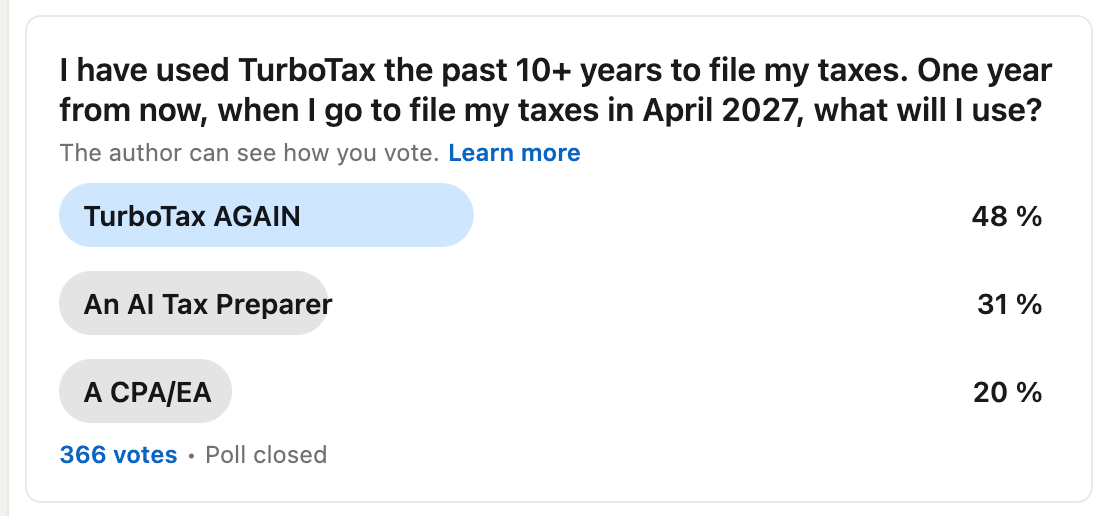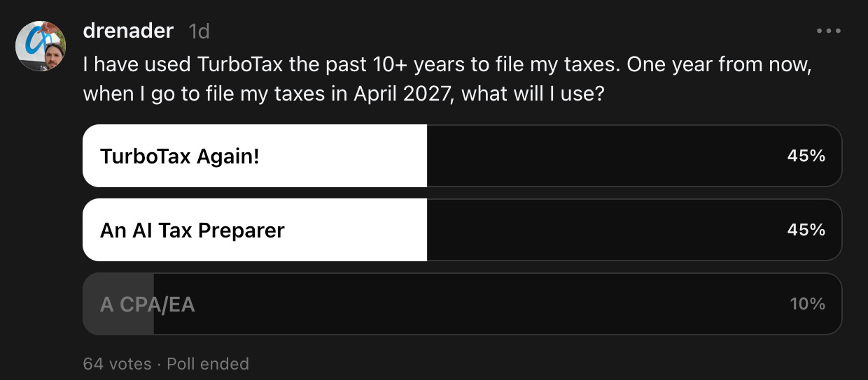 Most of you think I’ll use TurboTax again. But an AI tax preparer is honestly not as far off as I expected. On Threads, TurboTax held up about the same, but AI pulled much further ahead of the CPA crowd.