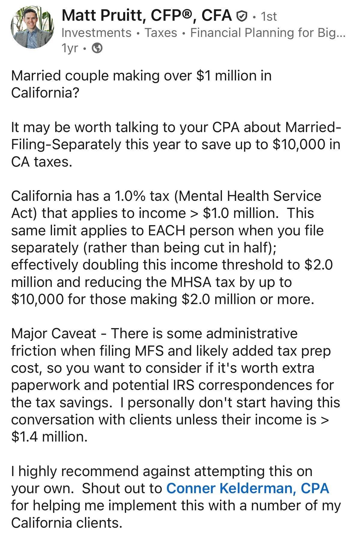 If you are married and earn >$1.5M in California, you should look into whether it makes sense to file as 'married filing separately' instead of 'jointly'. I know multiple households who made the switch, saving themselves upwards of $10k.