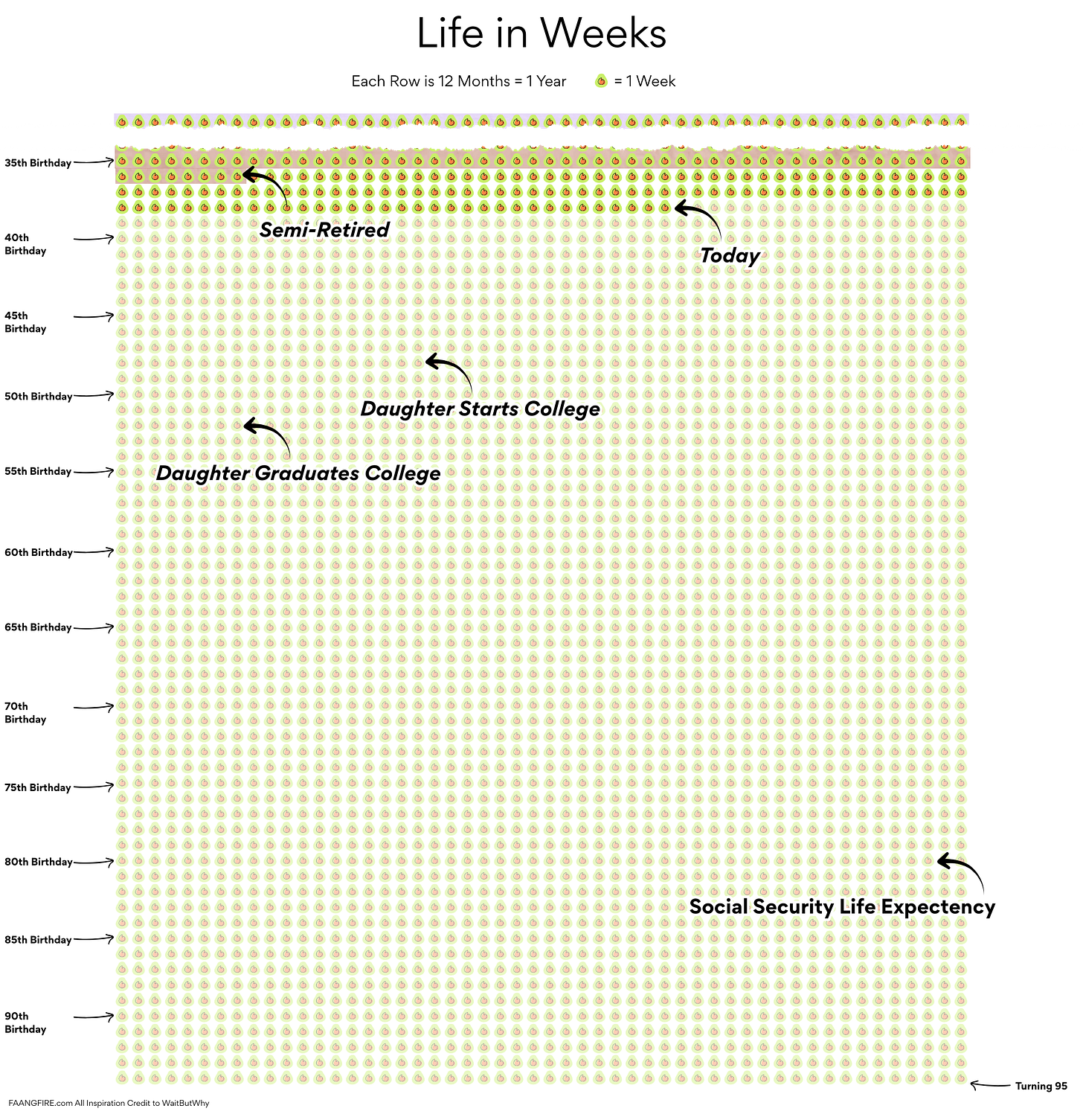 I dove into this concept back in early 2022 in a post titled “FIRE = TIME”, where I created my own version of Tim’s visual. A lot has changed since then, even though it’s only three more rows of squares filled in. I felt a fresh look was in order.