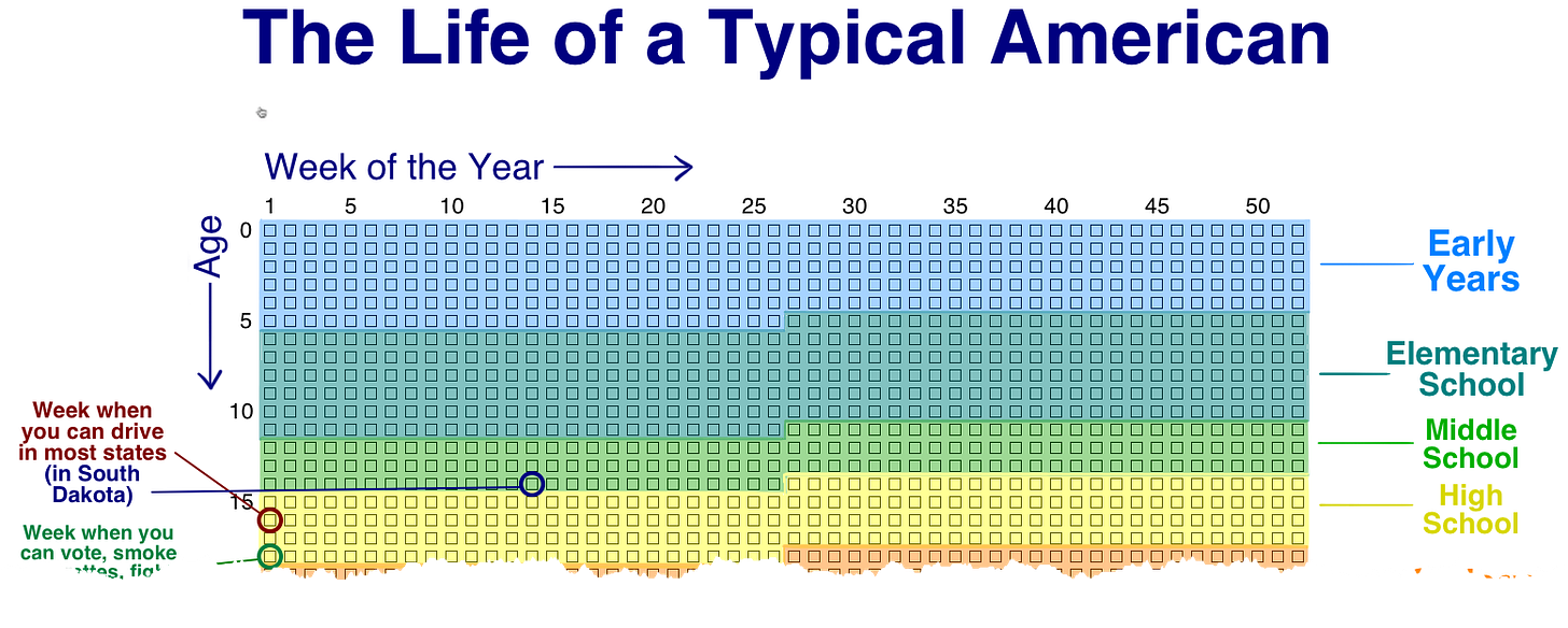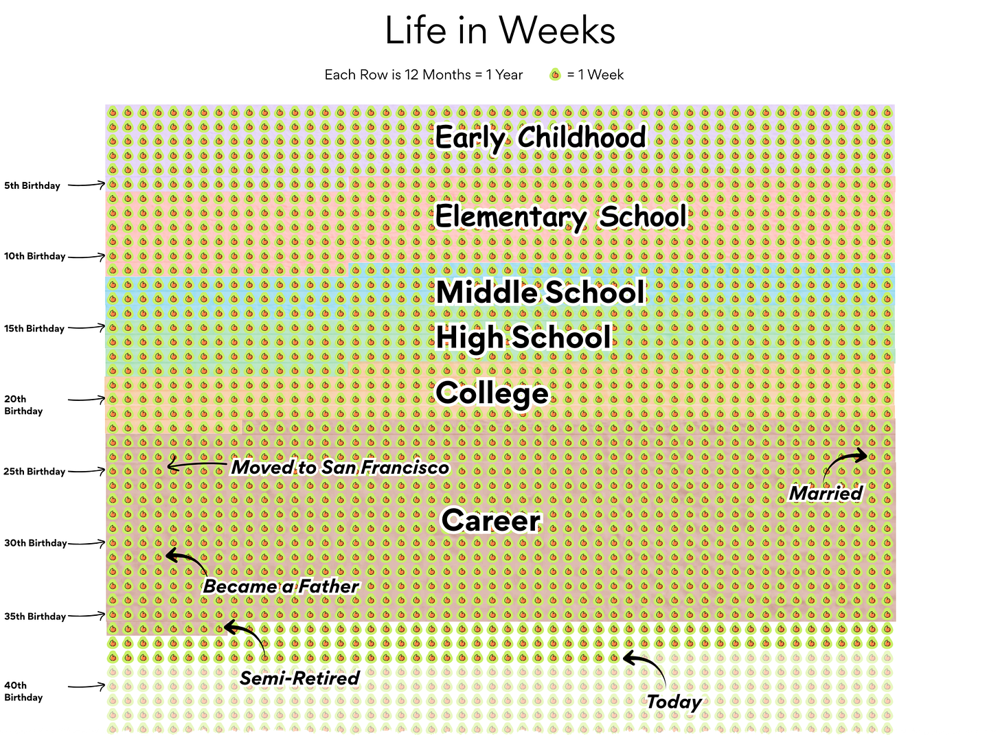 Tim Urban’s Life in Weeks is such a simple and powerful way to see your entire life laid out in weekly blocks. I always revisit it during the holidays as a forcing function to appreciate the time I have with my family.